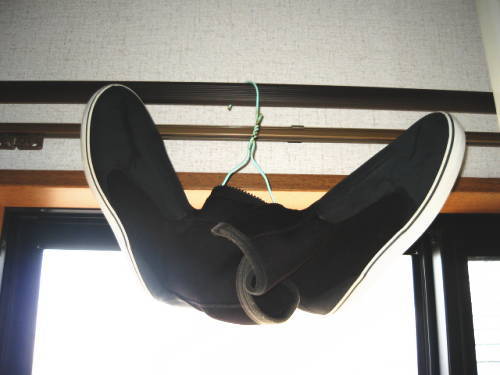 ●バンザイの部分に洗ったばかりのマリンブーツを引っかけて、干しておきます。