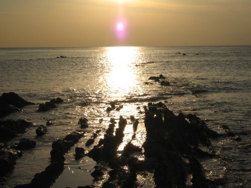 ちょうど夕暮れの時間、太陽の色が赤味を増しています。それが水面に反射して、海に赤い道ができているように見えることがあります。午後のオンショアの風は夕方にはたいてい強くなって、潮風を運んできます。