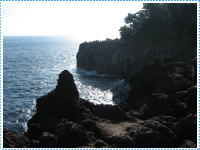 切り立った崖、複雑に入り組んだ海岸線は独特の景観です。リアス式海岸に似た風景ですが、もう少し荒々しい気がします。崖から陸側は、山というか丘になっていて、松を中心とした森が繁っています。この海と山のひっついた感じが好きです。