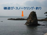 立石の岩場から浅いビーチや磯が続いていて、子供の磯遊びにも向いています。