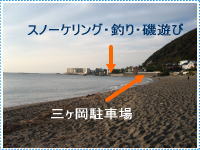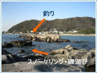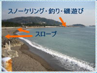 ビーチの左側、森戸神社下の岩場は磯遊びに向いています。